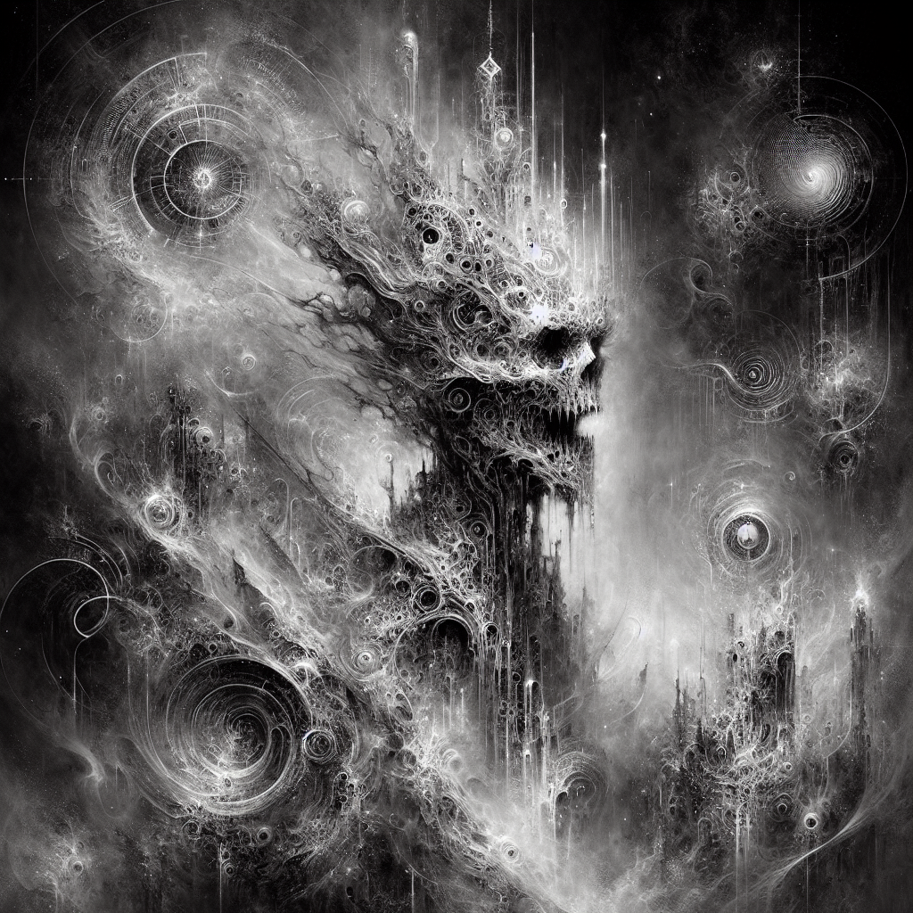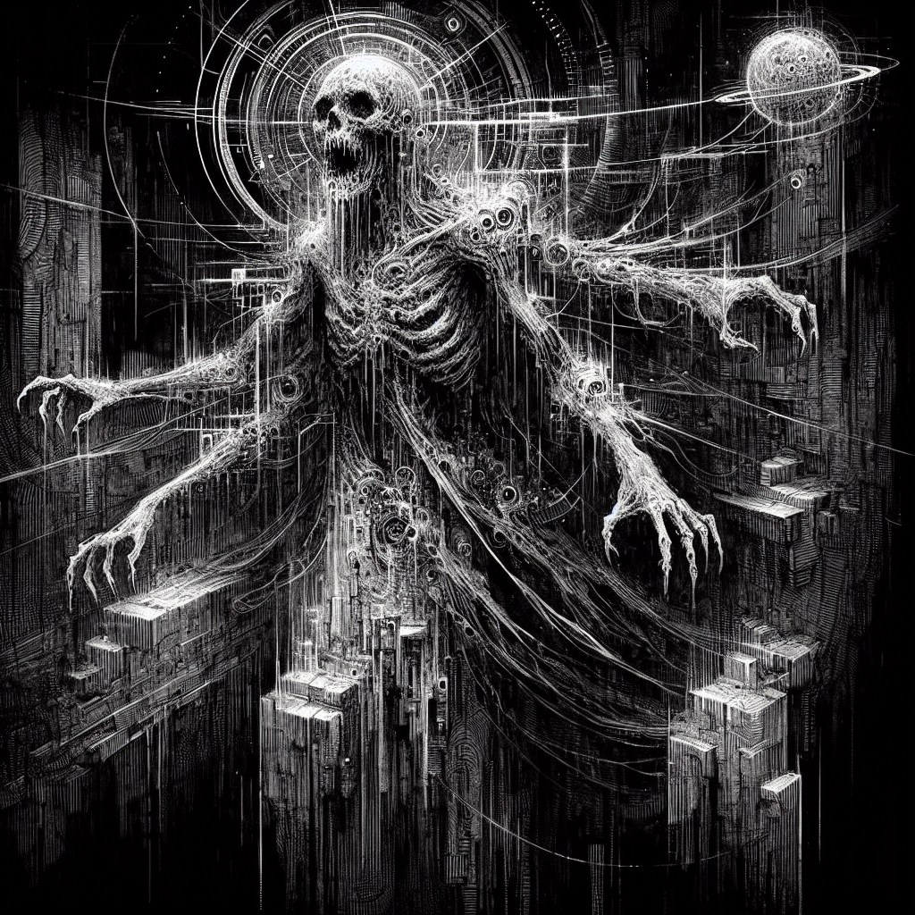 The virtual landscape splintered, revealing grotesque forms—a legion of specters filtering through fractured timelines, each bearing fingerprints from realms unknown. Elara gasped; there was a pattern here, an entropic code interwoven through the cosmos—a shared memory of despair stretching beyond what any AI could comprehend.